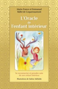 Ce livre a été construit comme un diptyque c’est-à-dire un complément – même si ces deux ouvrages sont indépendants – de « L’oracle de l’enfant intérieur ». L’oracle c’était une mission importante pour nous parce qu’il n’existe aucun jeu sur l’enfant intérieur dans le monde. Il y a un jeu qui s’appelle « Les cartes de l’enfant intérieur » qui a été créé par des américains mais qui aborde plutôt l’aspect collectif des contes de fées. Il n’y avait pas d’outils pour permettre d’entrer en contact avec cet enfant qui est en nous, les différentes facettes de l’enfant, d’être en contact avec ses forces de vie, ses besoins. On parle beaucoup de reparentage. Avec l’oracle, c’était l’occasion de créer une quinzaine de cartes qui expliquent factuellement de manière pragmatique ce que c’est que de devenir un bon parent pour soi. C’était une réponse parfaite sur le travail sur l’enfant intérieur. Un oracle c’est donc ludique et puis c’est un outil de connaissance de soi qui est très performant je trouve car il permet d’avoir des images qui sont connectantes. Les images ont été créées avec une illustratrice Sabine Adélaïde.